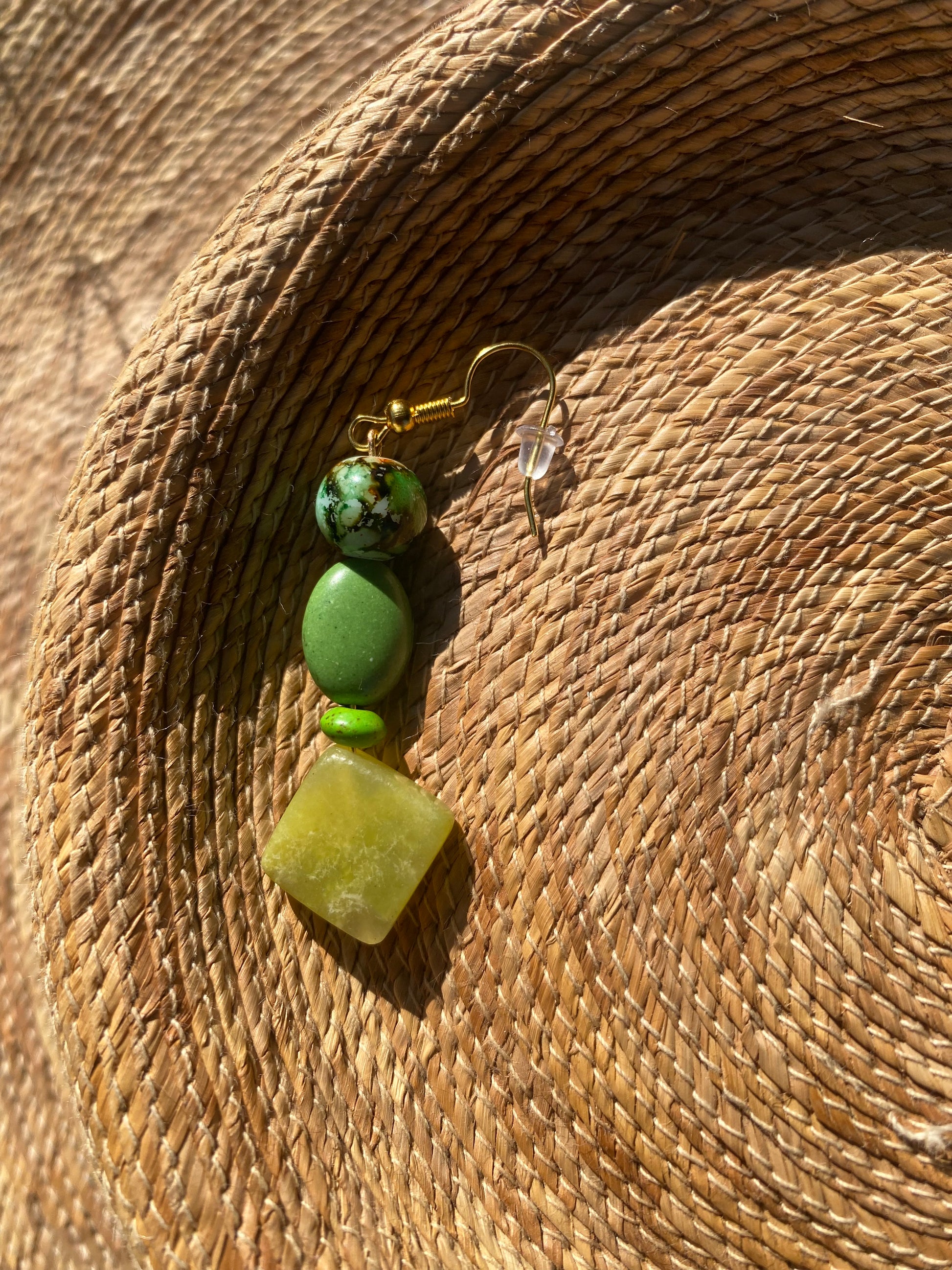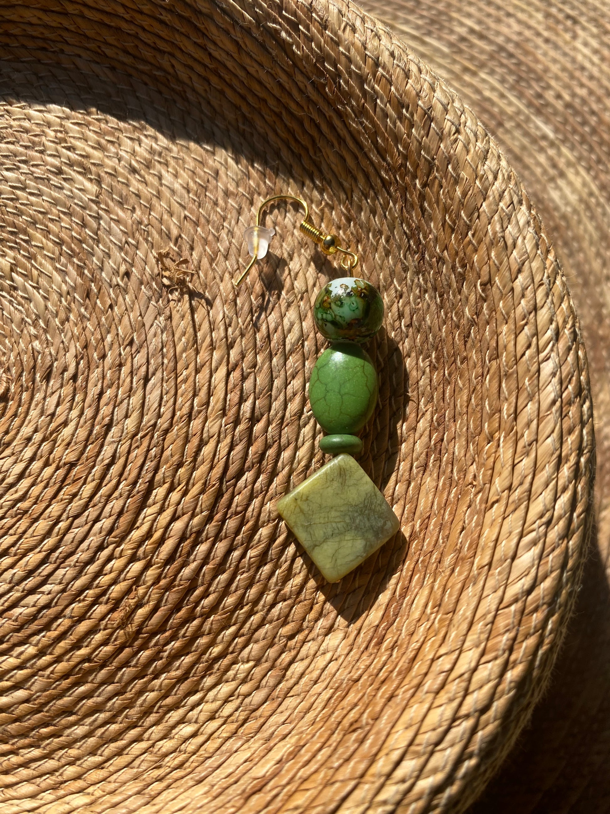 Flow with renewal and inner peace in our Serpentine Essence earrings. Crafted with inspiration from the serpentine stone—a soothing green crystal known for its grounding, protective energy—these earrings embody transformation and growth. Like the serpent that sheds its skin, Serpentine Essence symbolizes release, healing, and rebirth. Their earthy tones and organic design capture the gentle rhythm of nature, reminding you to move gracefully through change and embrace your evolving spirit.